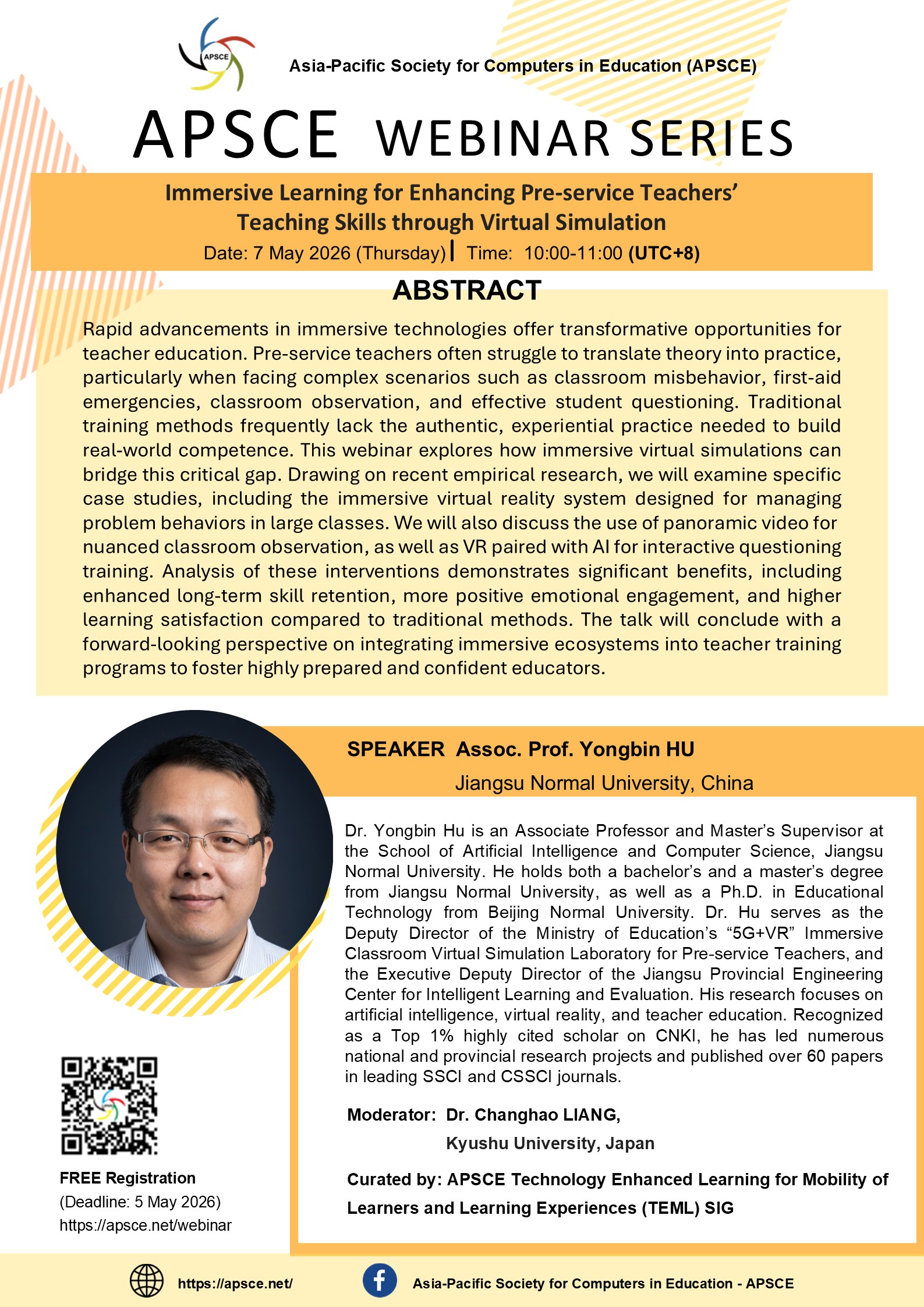 Rapid advancements in immersive technologies offer transformative opportunities for teacher education. Pre-service teachers often struggle to translate theory into practice, particularly when facing complex scenarios such as classroom misbehavior, first-aid emergencies, classroom observation, and effective student questioning. Traditional training methods frequently lack the authentic, experiential practice needed to build real-world competence. This webinar explores how immersive virtual simulations can bridge this critical gap. Drawing on recent empirical research, we will examine specific case studies, including the immersive virtual reality system designed for managing problem behaviors in large classes. We will also discuss the use of panoramic video for nuanced classroom observation, as well as VR paired with Al for interactive questioning training. Analysis of these interventions demonstrates significant benefits, including enhanced long-term skill retention, more positive emotional engagement, and higher learning satisfaction compared to traditional methods. The talk will conclude with a forward-looking perspective on integrating immersive ecosystems into teacher training programs to foster highly prepared and confident educators.